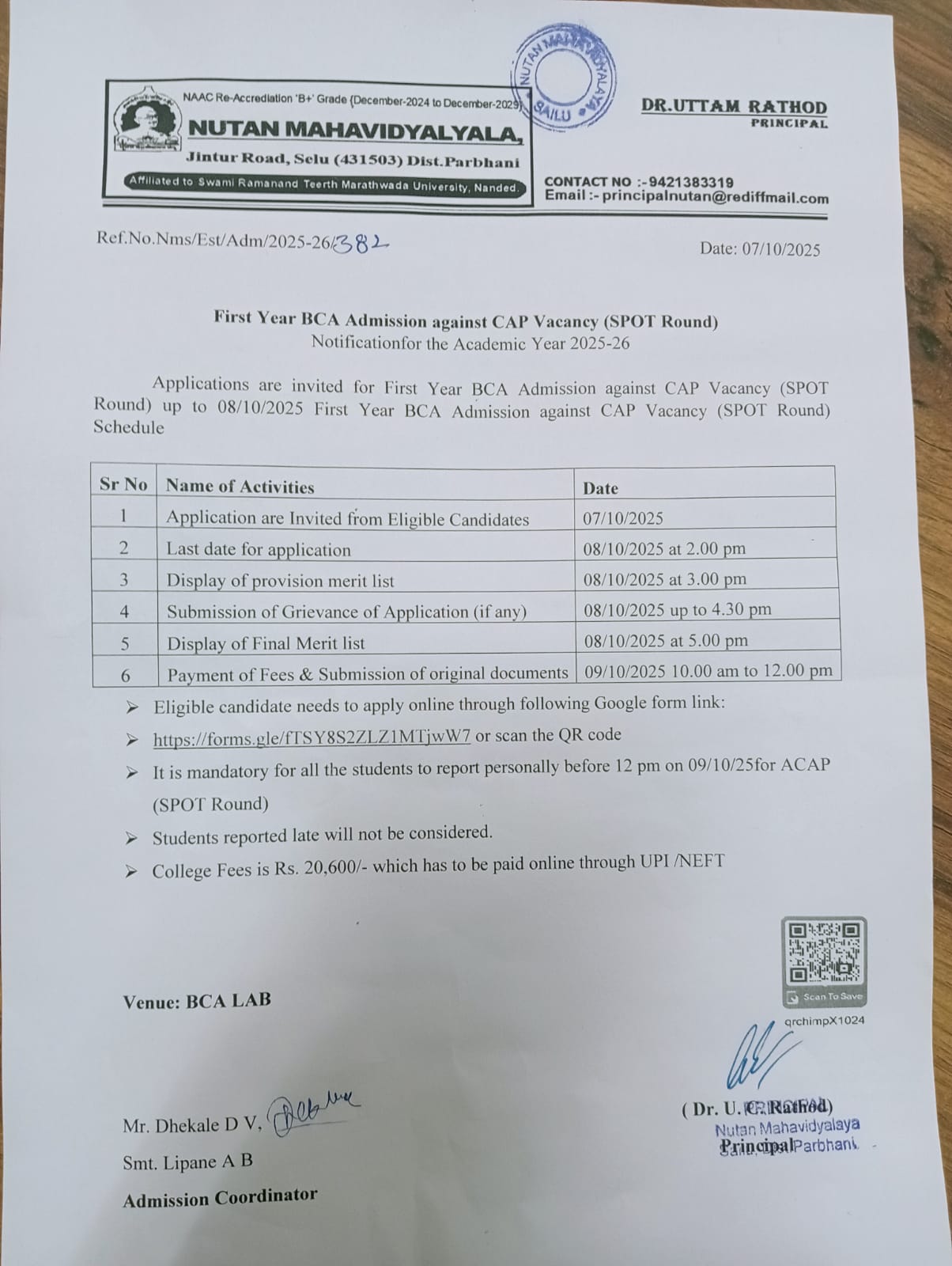 It gives me immense pleasure to welcome you all to our esteemed college Nutan Mahavidyalaya, Selu, where we strive to provide quality education and shape the future of our students. As the Principal, it is my responsibility to ensure a conducive learning environment and facilitate your academic journey in the best possible manner. At our college, we offer a diverse range of undergraduate programs including Bachelor of Arts (BA), Bachelor of Science (B.Sc), Bachelor of Commerce (B.Com) and BCA as well as Post Graduate Program in History and Marathi. Apart From it, we have center of Yashwantrao Chawan Maharashtra Open University for BA And B.com Program and the college runs seven distance Pot graduate programs of affiliating University Swami Ramanand Teerth Marathwada University, Nanded. These programs are designed to equip you with the necessary knowledge and skills to succeed in your chosen fields. We have a team of dedicated faculty members who are experts in their respective disciplines and are committed to your academic growth.